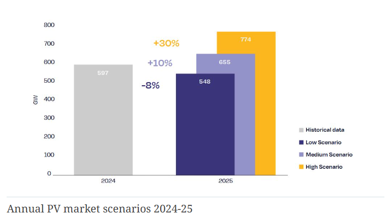 Selon le dernier rapport Global Market Outlook for Solar Power 2025-2029 de SolarPower Europe, le solaire mondial est en plein expansion. Les installations photovoltaïques mondiales pourraient atteindre 655 GW en 2025, contre 597 GW en 2024. Si cette prévision se confirme, cela représenterait une croissance annuelle de 10 %, portant la capacité solaire cumulée à 2,2 TW.
